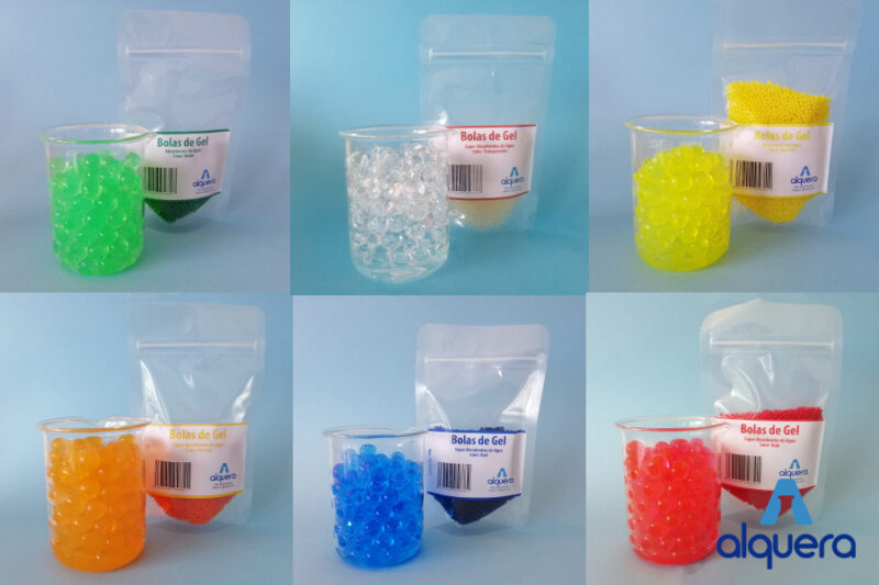 These little balls, gel balls, absorb a large amount of water, changing from small, hard balls to larger, gelatinous balls with water inside.